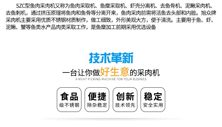旭眾XZC系類魚肉采肉機(jī)是一款專業(yè)加工魚肉去刺、蟹蝦去殼的機(jī)械,由于隨著市場的發(fā)展,人們生活中漸漸離不開有魚的生活,無論是家里、飯店等魚都是主要的食物還有現(xiàn)在一些休閑食品中都是離不開魚加工后的魚泥。魚肉采肉機(jī)的研制成功給人們生活中帶來很多方便,無論是您做魚丸、魚餡等只需要一款魚肉采肉機(jī)就可以實(shí)現(xiàn),對(duì)于大量生產(chǎn)即降低了人工成本,又提高了生產(chǎn)效率。